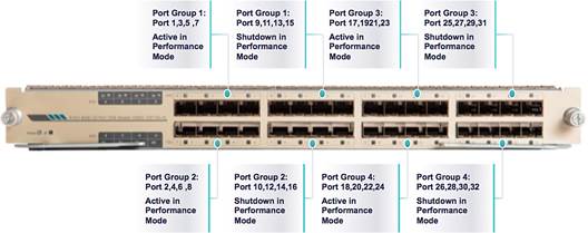 ◦ In performance mode, the second four ports in each port group operate in shutdown mode.